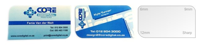Not all corners have to be rounded. You may add a 6mm, 9mm or 12mm round corner to 1 corner or even to all 4 corners but only 1 radius option may be used on your cards. The image above only serves to illustrate all the radiuses.